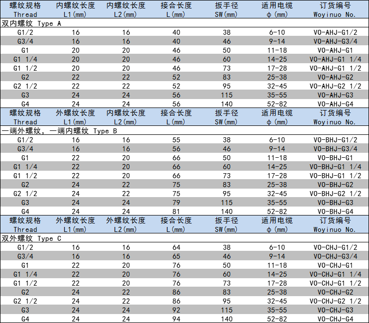 螺纹形式:双外螺纹;双内螺纹,一端外螺纹,一端内螺纹